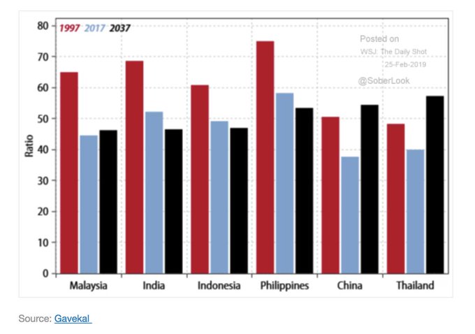 Yes China is aging. But we should put this in perspective. In 2037 its dependency ratio will be approximately that of India or Philippines today (loaded towards older end of course). @Gavekal via @SoberLook